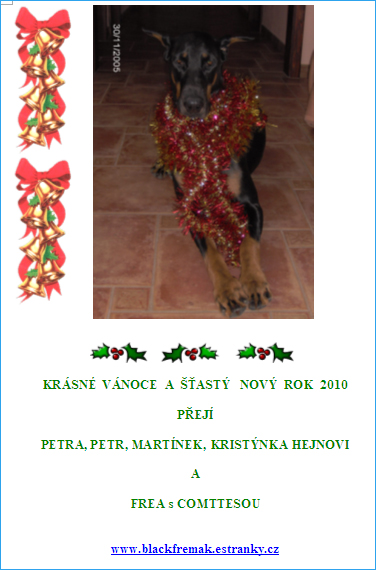 Stejně jako v posledních několika letech, i letos budeme mít pro vás přehlídku nejrůznorodějších vánočních přání, které nám zaslali naši přátelé či kolegové kynologové chovající nejrůznější plemena. Nová aktualizace bude vždy označena tučnými písmeny AKTUALIZACE s příslušným datumem + bude změněna hlavní fotka tohoto článku.