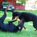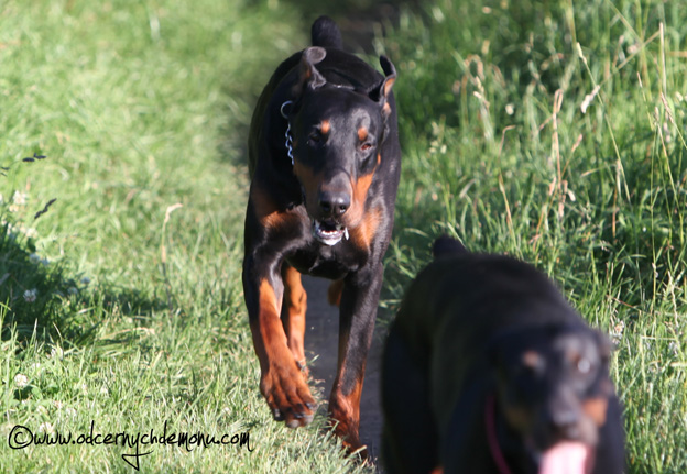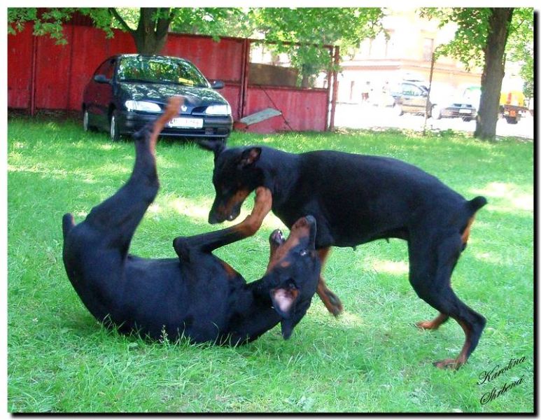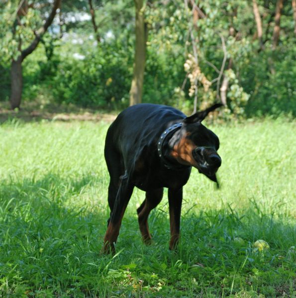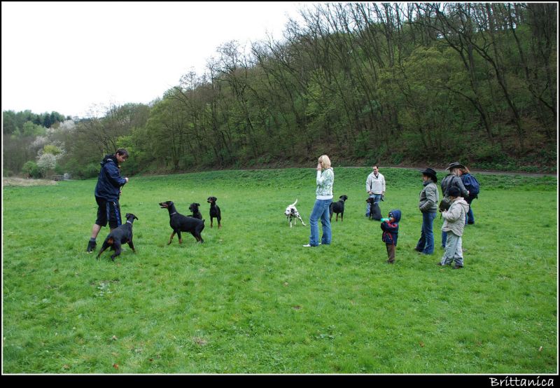 Minulou neděli jsme vyrazila se třemi štěňátky, malou Brittuškou (Dolce Britta dB), Dantem (Druss dB) a Doylíkem (Doyle Proffi dB), viz. obojek, na návštěvu k tatínkovi našeho vrhu D, Jazzym (Charm Antis). Jazzy se choval ke štěňátkům doslova otcovsky, byl na ně opatrný, hlídal si je a olizoval je. Při této příležitosti jsme dali i štěňátkům „kousnout" na kůžičku, což se jim moc líbilo. Pochopitelně se i fotilo a natáčelo.