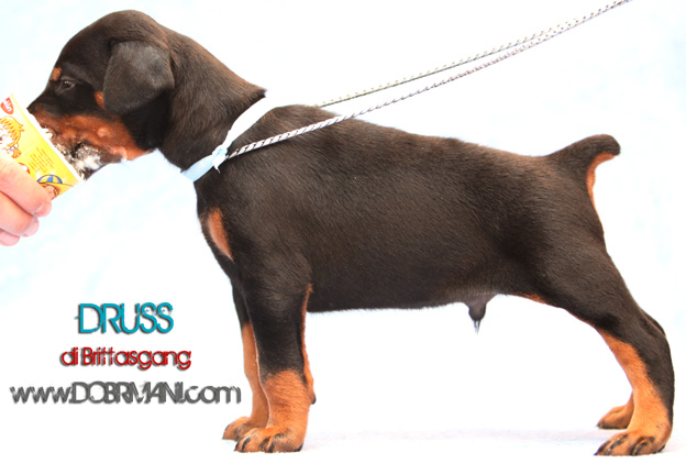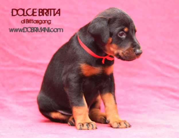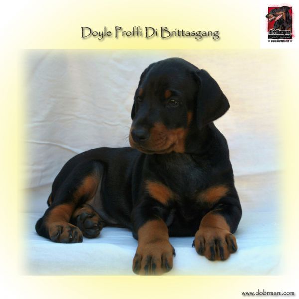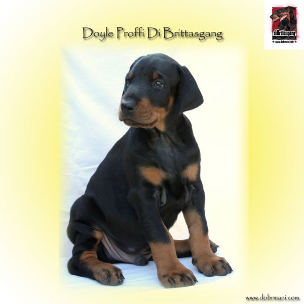 Nabízíme úžasného kluka, který čeká na svého páníčka s milujícím srdcem a láskyplnou náručí. Jedná se o černého vymazleného dobrmánka jménem Doyle Proffi di Brittasgang, který je plný energie, má zájem o hry se svými sourozenci, je velmi zvídavý, líbivý a rozený průzkumník. Vyžaduje pozornost a je rád za každé pohlazení.