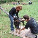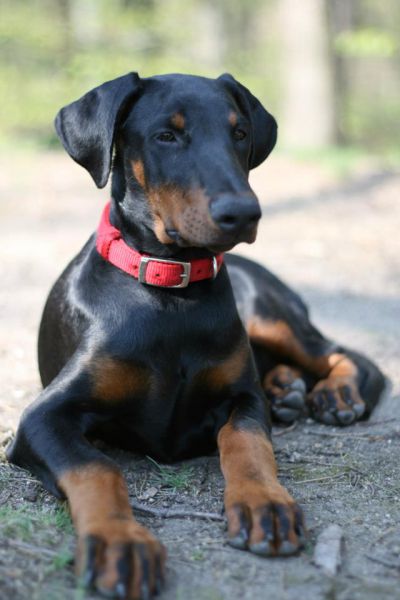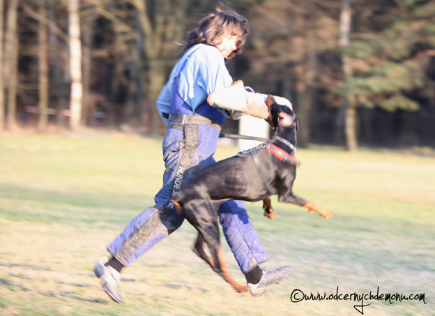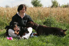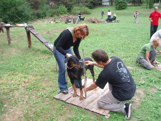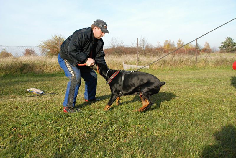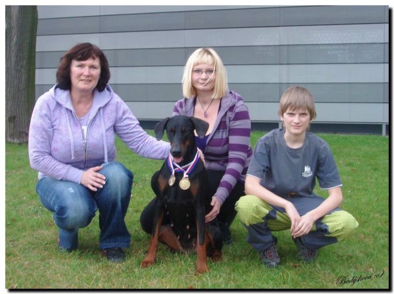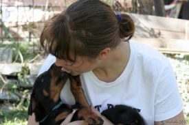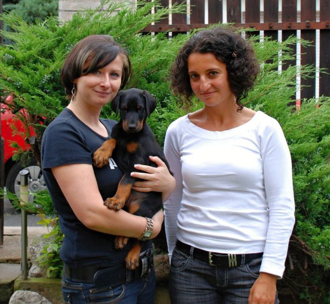 Minulou neděli jsme vyrazila se třemi štěňátky, malou Brittuškou (Dolce Britta dB), Dantem (Druss dB) a Doylíkem (Doyle Proffi dB), viz. obojek, na návštěvu k tatínkovi našeho vrhu D, Jazzym (Charm Antis). Jazzy se choval ke štěňátkům doslova otcovsky, byl na ně opatrný, hlídal si je a olizoval je. Při této příležitosti jsme dali i štěňátkům „kousnout" na kůžičku, což se jim moc líbilo. Pochopitelně se i fotilo a natáčelo.