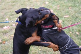 Dante je však i zbojník. Provokuje všechny, kteří se v tu chvíli zdají ještě v klidu. Na jedné fotce je vidět, jak za sebou zlákal celou smečku... Přes plac, kde jsme stáli, za ním letělo asi pět dalších štěňat. Dělá ze sebe vůdce smečky a láká všechny k lumpárnám...kdo se nechce přidat, na toho navede celou skupinu, která ho převálcuje...a hned jich běží o jednoho víc. Nejvíc se nechala rozdovádět samozřejmě ségra, malá Britta...stejná krev a k tomu ještě houževnatý dobrman, který nemůže zůstat pozadu.