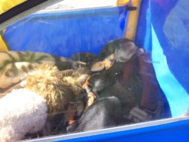 Po cestě si chvilku poplakal, ale zbytek cesty pak spinkal. Když jsme dorazili dom, dala jsem ho do pelíšku a nechali jsme ho, aby si sám vylezl a vše prozkoumal. Kočičáci byli samozřejmé v pohotovosti, Dai se k nim rozeběhl, ale první zasyčení ho zastavilo, takže chvilku před nimi couval, ale po chvilce změnil taktiku a začal štěkat, takže je zahnal na ústup ). tak se chvilku seznamoval, zkusili jsme piškoty s tvarohem, ale vzal si jen trošku a usnul.