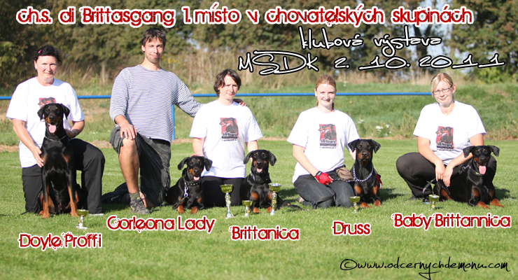 Při nedělním klání na Národní výstavě Brně Doylík (č. JCh. Doyle Proffi di Brittasgang) získal svého prvního CAJCe a stal se tak čekatelem Junioršampiona ČR & Sendynka (Multi Ch. Baby Brittannica di Brittasgang) získala ve třídě vítězů, V1, CAC titul Národní vítěz a titul BOB. Tímto se může Sendynka pyšnit titulem Grandšampion krásy ČR. Příjemná je i skutečnost, že se velmi hezky umístila Sendynky nejlepší kamarádka Sárka, (č. JCh. Agamga Anibag) V1, CAJC & BOJ, tedy naše širší rodina. Máme z Doylíka a jeho majitelů, Sendynky i Sárky, velikou radost.
