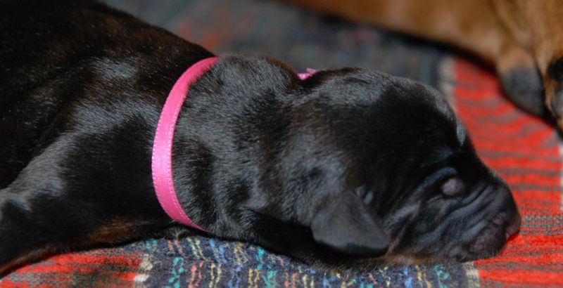 Ráno Růžence začala odcházet plodová voda a narodil se první pejsek, který od nás dostal červenou mašličku.