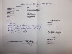 Tentokrát naši chovatelskou stanici zastupoval Eliášek (Eliáš di Brittasgang), který se představil na své první výstavě a ve třídě dorostu obdržel známku VN1 a moc hezký posudek: 6 měs. pes, dobrá hlava, silná dlouhá tlama, pěkný dlouhý krk, pevný hřbet, dobrá hloubka hrudníku, dobře zaúhlený.