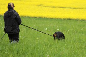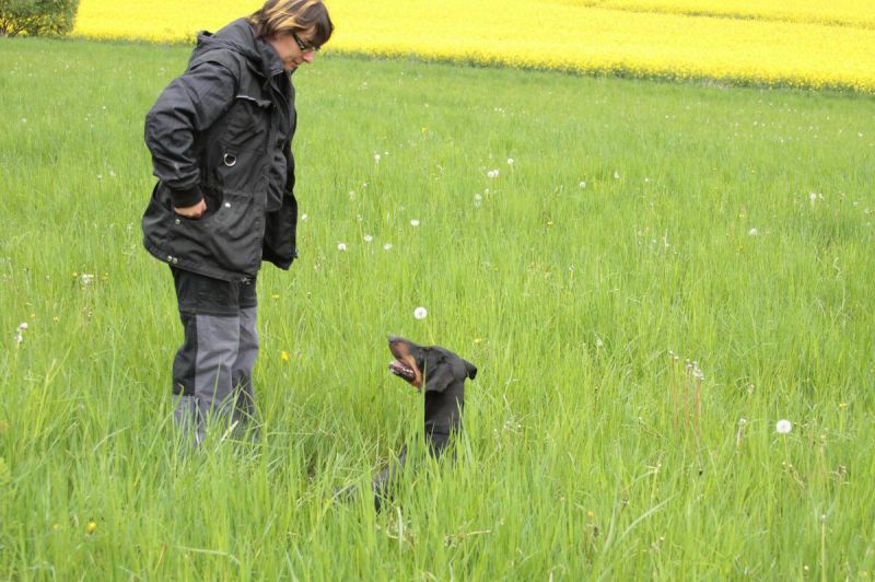 Tráva byla již vysoká, ale nosy jsou zabořeny až u země. Za foto i hezky strávené odpoledne děkuji Míše. Výcvik jsme zakončili procházkou s Jazzym & Vajíčkem.