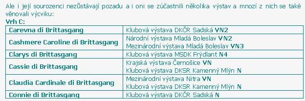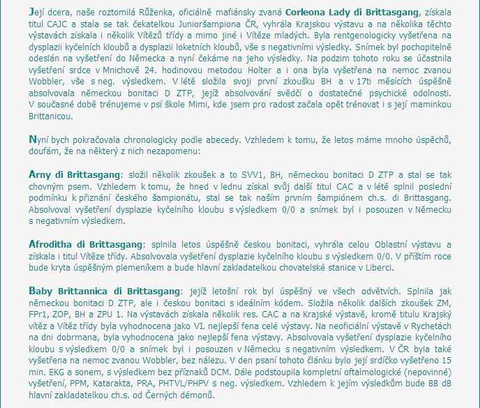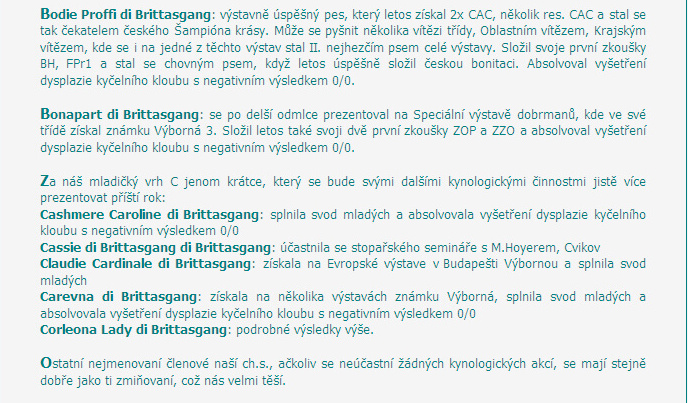 Minulý rok byl protkán vesměs dobrými událostmi, ať už zmíním jakoukoliv sféru činností, kterým se věnujeme či kterých si hledíme. I přesto, že máme pod svými křídli pouze 3 (1+2) vrhy, pořád se u nás něco děje. Ve výstavní sféře si troufáme tvrdit, že se minulý rok nejvíce dařilo Baby Brittannice dB, která za tento rok nasbírala opulentní množství výstavních titulů a stala se tak čekatelkou Šampióna ČR + SR + Klubového šampiona a Interšampiona. Dobře se dařilo i naší Corleoně Lady dB, která získala Národního vítěze a také čekatelství Českého šampiona. Úspěšný byl i Arny dB, který se stal čekatelem Klubového šampióna ČR a zároveň i získal i Krajského vítěze 2009 ve velmi zajímavé konkurenci. Stejně tak i Bonapart dB, který rovněž získal čekatelství Českého šampiona. V pracovní sféře se velmi dařilo Bodiemu Proffi dB, který ačkoliv byl již uchovněn v ČR, splnil i mezinárodní podmínky chovnosti, ZTP s čistým kódem V1A a splnil zkoušky FPr. 2 a FPr. 3. Prospěšně se dařilo i jeho sestře Baby Brittannice dB, která složila stopařskou zkoušku druhého stupně FPr. 2. Její polosestra Corleona Lady dB složila zkoušky ZZO a ZOP a její sestra Carevna dB složila zkoušku BH a prvotní českou bonitaci, čímž i ona splnila podmínky chovnosti, které byly doplněny o opakované vyhodnocení RTG DKK v Německu s výsledkem HD A. Jejich maminka Brittanica HP také nezahálela a složila zkoušku ZPU 1. O veškerých výsledcích se dočtete na těchto stránkách věnované jak našim fenám, tak i jednotlivě rozepsané reference o našich odchovech. Co se týká chovatelských soutěží, na Klubové výstavě dobrmanů jsme se společně umístili na III. místě, kterou jsme prezentovali v našich jednotně sladěných „dresech" s logem naší chovatelské stanice.