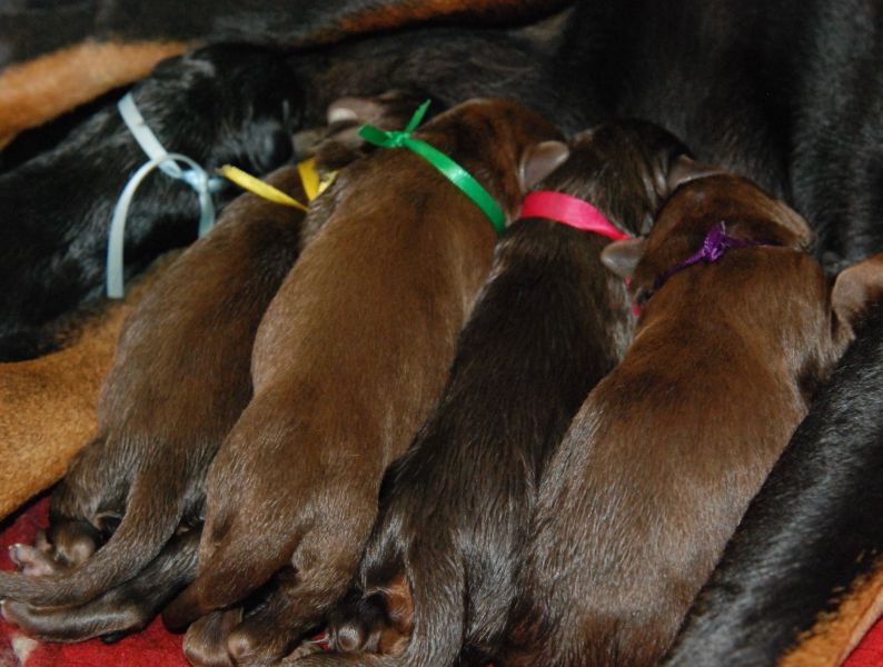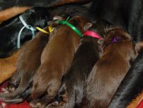 Všichni jsou v pořádku, porod proběhl doma hladce a přirozeně, Boženka je opět skvělá maminka, štěňátka jsou velmi aktivní, ale zároveň hodná. Jsem velmi spokojená i nadšená a štěňátka si nesmírně užívám. V naší chovatelské stanici Brittasgang se poprvé narodily hnědé holčičky. Jedná se o vrh G Brittasganng.