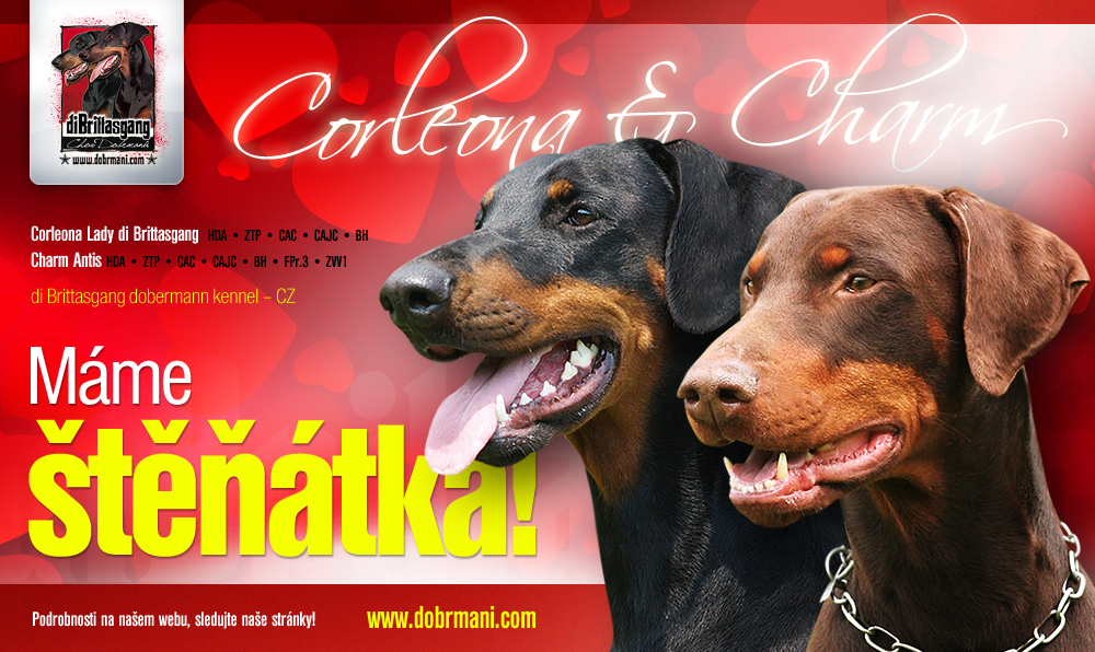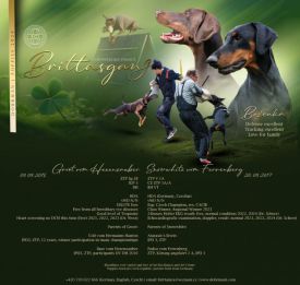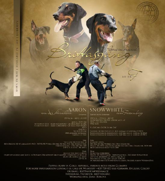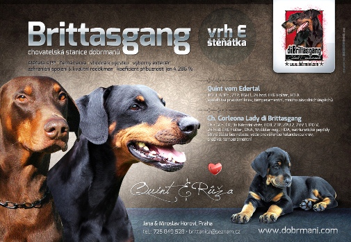 Chovatelská stanice Brittasgang nabízí štěňata dobrmana s PP ze zahraničního krytí. Oba rodiče německého původu, opakovaně vyšetřené srdce, čisté rtg kyčlí, v rodokmenu vrcholové zkoušky IGP 3, německou bonitaci ZTP a německou výběrovou bonitaci Körung. Matka štěňátek je čekatelka šampiona, s německou bonitací ZTP a čistým kódem ZTP V1A, ohodnocena předním německým rozhodčím panem Thomasem Bechtem. Naše chovatelská stanice rodinného typu byla založena před 20 lety a řídí se heslem pes přítel člověka, proto hledáme ty, kteří chtějí mít psa po svém boku jako parťáka. Štěňata jsou také vhodná pro jakýkoli sport i na výstavy. V naší chovatelské stanici máme ještě jednu dospělou fenku dobrmana a zachráněnou handicapovanou fenku. Všechny spolu žijí ve vzájemné harmonii, a stejně vedeme i náš chov se štěňaty. Na výběr jsou dvě černé fenky, jeden černý pejsek a jeden hnědý pejsek. Odběr na začátku letních prázdnin, okres Kutná Hora. Štěňata s námi žijí v domě pod nepřetržitým dohledem. V případě dalších dotazů nás prosím kontaktujte na mobilním telefonu 720 023 666 nebo na emailu brittanica@seznam.cz