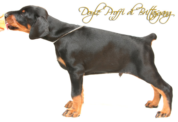 Posudek: Čtyřměsíční, na svůj věk dobře vyvinutá fena, pěkná dlouhá hlava s tmavým okem, elegantní dlouhý krk, ještě nepatrný del. tělesný rámec, již pěkný hrudník, pěkná spodní linie, výborné úhlení předních končetin, dobrá srst i pálení, dobrá mechanika pohybu.